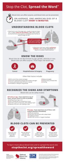Share our infographic as a guide to information about risk factors, signs/symptoms, and prevention and watch our short video with the most important blood clot info people need to know.