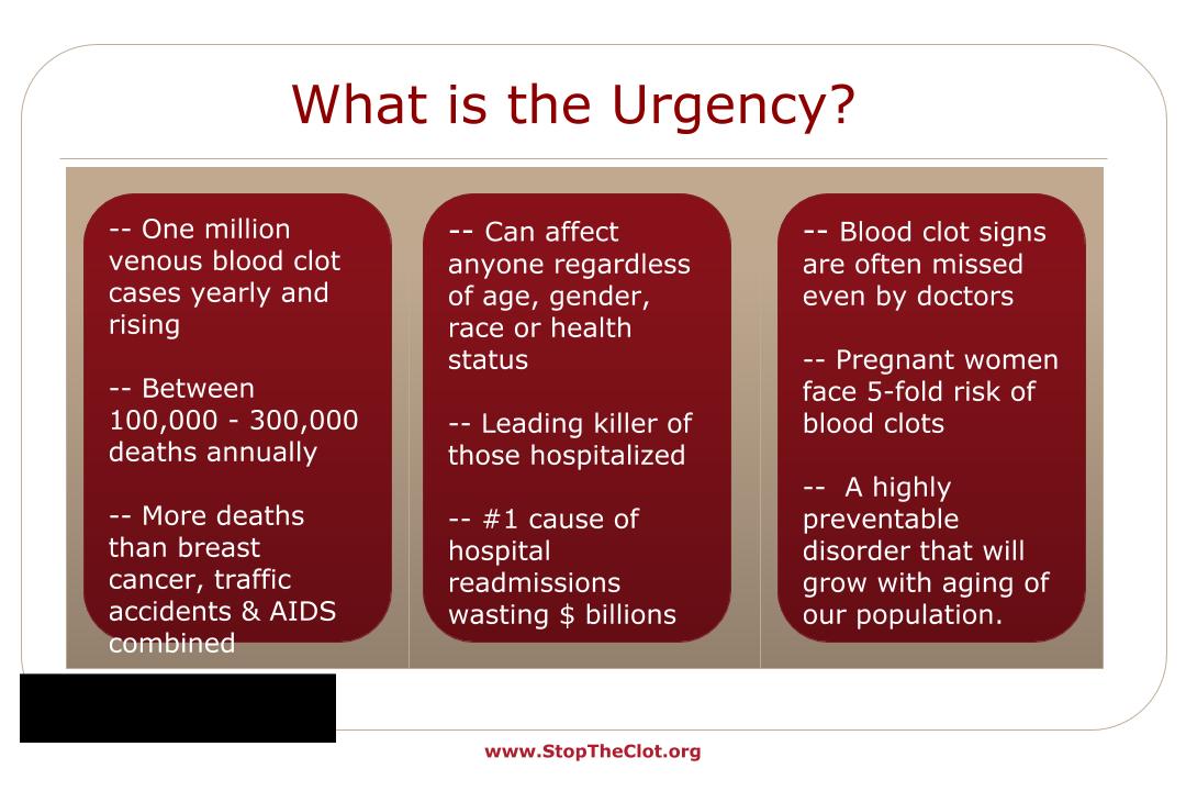 No American is immune from blood clots, regardless of age, gender, race, ethnicity or health status. Normal blood clots play an important role in protecting our health because they stop bleeding from a cut or wound. However, blood clots can also form abnormally, causing a heart attack, stroke, or other serious medical problems. Experts estimate that two million Americans suffer such venous and arterial blood clots every year. More than 200,000 Americans die from them annually. An often silent killer, death can be sudden with no forewarning. But in most instances, the damage can be averted or contained. Age, smoking, obesity can all contribute to clotting risk, but so can birth control or pregnancy or cancer. Even prominent athletes in peak physical condition have suffered career- ending, life -threatening clots. It can happen to any of us. In fact, the memories of former U.S. Reps. Walter Capps (D-CA) and Jennifer Dunn (R-WA), who died due to blood clots while serving in Congress, motivated the creation of National Blood Clot Awareness Month in March of 2009.