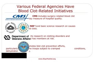 Many federal agencies play important roles in the effort to reduce death and disability from blood clots and clotting disorders. The National Institutes of Health and the National Science Foundation support the work of basic scientists in their efforts to understand the causes and effects of blood clots and identify improved treatments. The VA also supports research in this field and strives to prevent blood clots in the special population of Americans it serves. The Agency for Healthcare Research and Quality in 2001 was among the first to recognize that blood clot prevention in hospitals was our best opportunity for patient safety improvement. The Partnership for Patients makes made blood clot prevention a key component of improved hospital care. CMS includes surgery-related blood clot prevention as a key measure of hospital quality. DOD has examined how blood clots can be prevented in the military, affecting soldiers who must often live in cramped conditions, suffer dehydration and experience bone fractures and more severe injuries that require surgery.