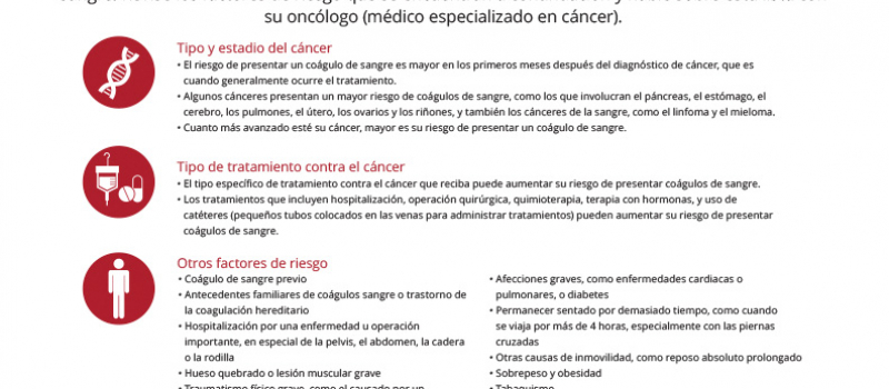 Una medida importante que debe tomar es comprender su riesgo de coágulos de sangre peligrosos, porque el cáncer y algunos de sus tratamientos pueden aumentar su riesgo de presentar estos coágulos. Hable con su equipo de atención médica sobre su riesgo de coágulos de sangre. Asegúrese de que su oncólogo (médico especializado en cáncer) y su equipo de atención médica sepan sobre sus antecedentes personales y familiares de coágulos de sangre.